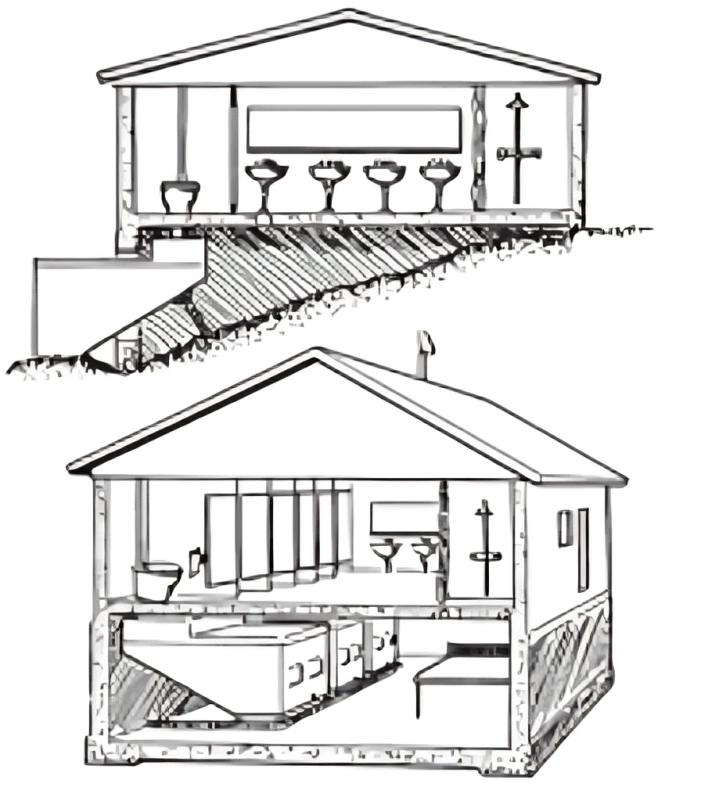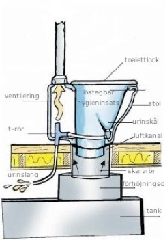 Gaser och avdunstande vätska leds genom ett ventilationsrör som mynnar ut genom taket. Ventilationsrörets storlek ger ett undertryck i behållaren vilket resulterar i ett luktfritt toalettrum. Rännorna luckrar upp, sprider och luftar avfallet och den väl avvägda lutningen på glidbanan gör att latrin och avfall förflyttar sig i rätt hastighet mot tömningsluckan.